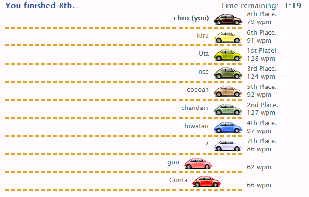 俺といえば、Typeracerはもうやるほど酷くなっていった感じ。最後はwpm70台とか連発するザマ。